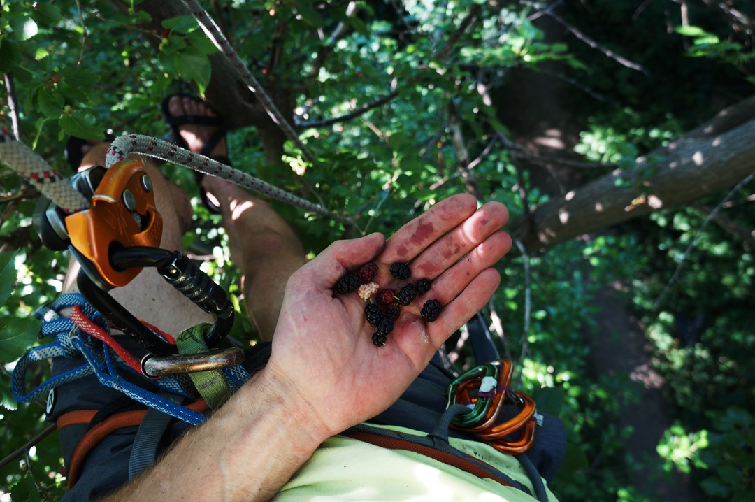 During mulberry season we spend almost everyday for an entire month picking mulberries. Mulberries are incredible fresh, frozen in smoothies, or cooked in oatmeal. We eat them by the POUNDS. There are tastier wild berries but nothing competes with the megatons of fruit that grow on mulberry trees. July is a great month to start your search but be careful because they stain everything!